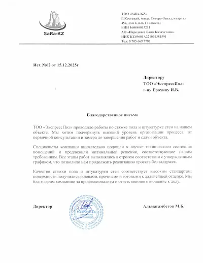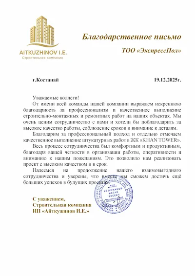 Компания «ЭкспрессПол» с 2017 года является ведущей организацией в Костанайской области в сфере современных технологий отделки помещений. Мы специализируемся на устройстве механизированной полусухой стяжки пола и механизированной штукатурки стен (гипсовой и цементной), что позволяет нам выполнять работы безупречного качества, быстро и по оптимальной стоимости.